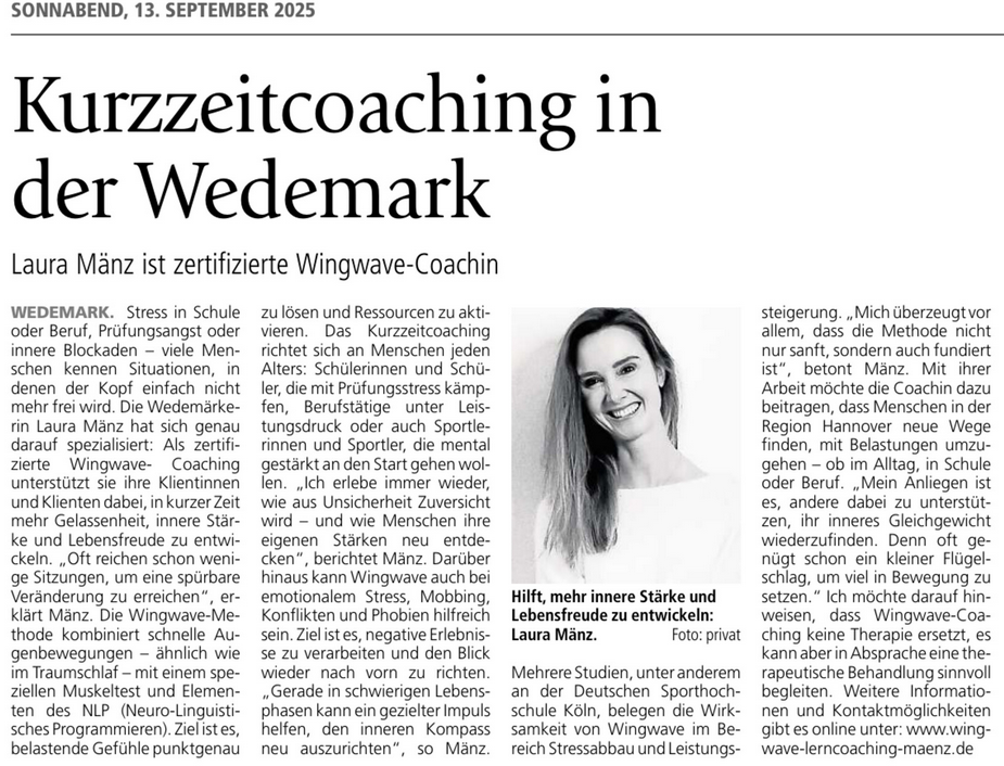Mit der wingwave®-Methode biete ich ein effektives Emotions- und Leistungscoaching, das hilft, Stress, Erfolgsblockaden und einschränkende Glaubenssätze schnell und nachhaltig abzubauen. Dabei aktivieren wir vorhandene Ressourcen und stärken die Resilienz.
